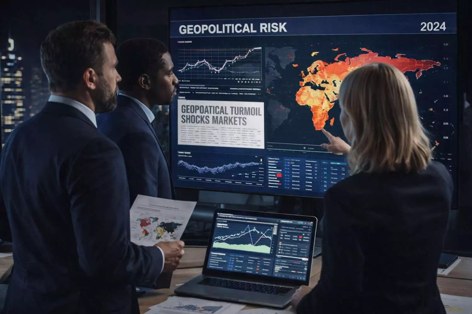Executives analyzing geopolitical risk data and market signals to anticipate regulatory shifts and global disruptions before they impact business strategy.
