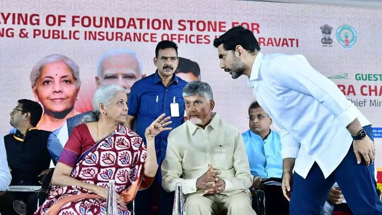 Union Finance Minister Nirmala Sitharaman having a word with IT Minister Nara Lokesh as Chief Minister N Chandrababu Naidu looks on during ground-breaking ceremony of 15 BFSIs’ buildings at Amaravati on Friday