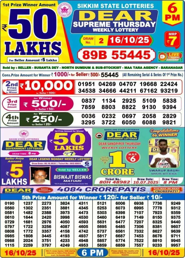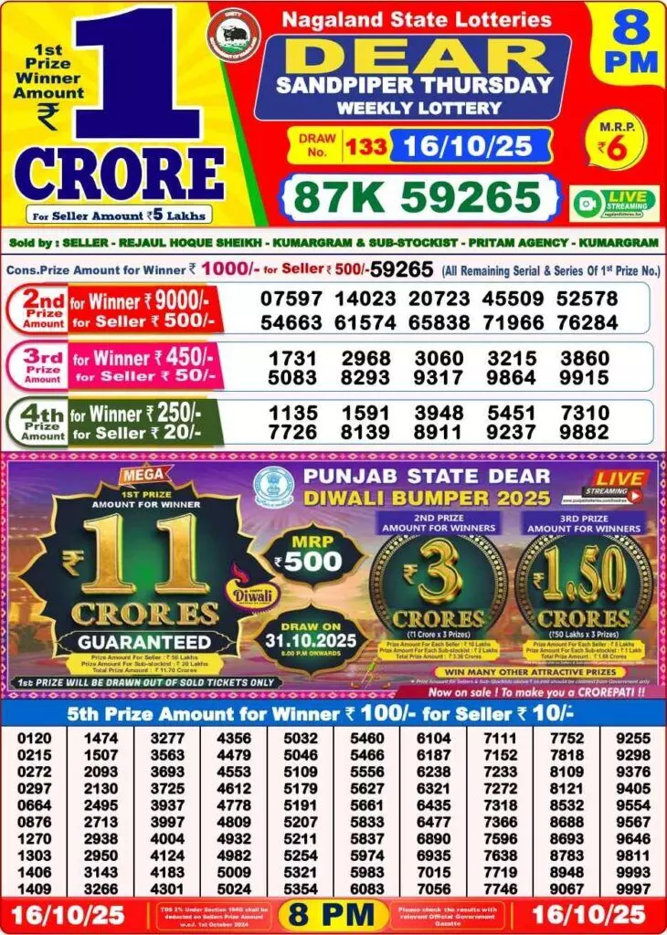 Nagaland Lottery Sambad Result Today, 16 October 2025: Live Updates for 8 PM Dear Mahandi & Complete Winners List