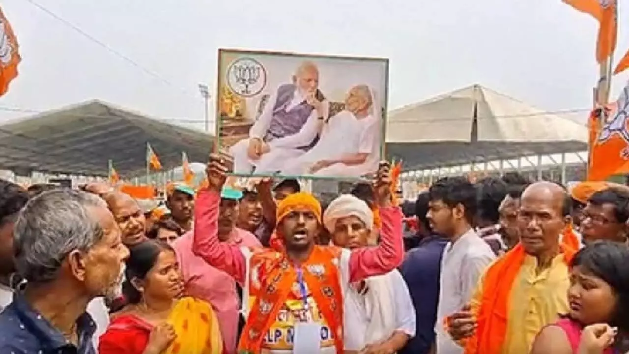 Since Sunday morning, BJP supporters were seen arriving in groups, carrying party flags and raising slogans, as the venue gradually filled up.