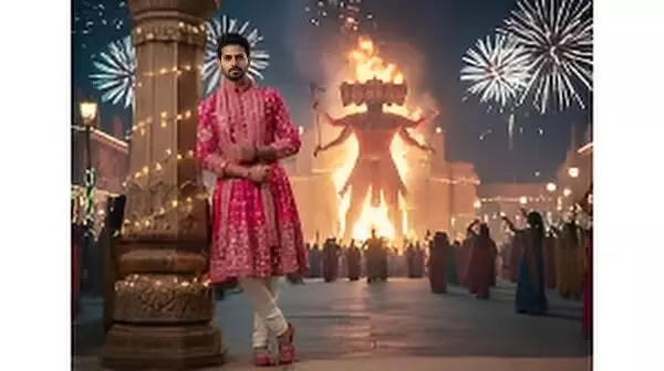 “Create an ultra-realistic cinematic 9:16 full-body portrait of a young Indian man. Keep the face and hairstyle identical to the uploaded photo. He wears royal traditional attire: a golden-red embroidered kurta, matching dhoti, and a regal stole. He holds a glowing bow and arrow, ready to shoot. The background features a massive burning Ravana effigy, golden fireworks, and glowing lamps, reflecting the triumph of good over evil.”